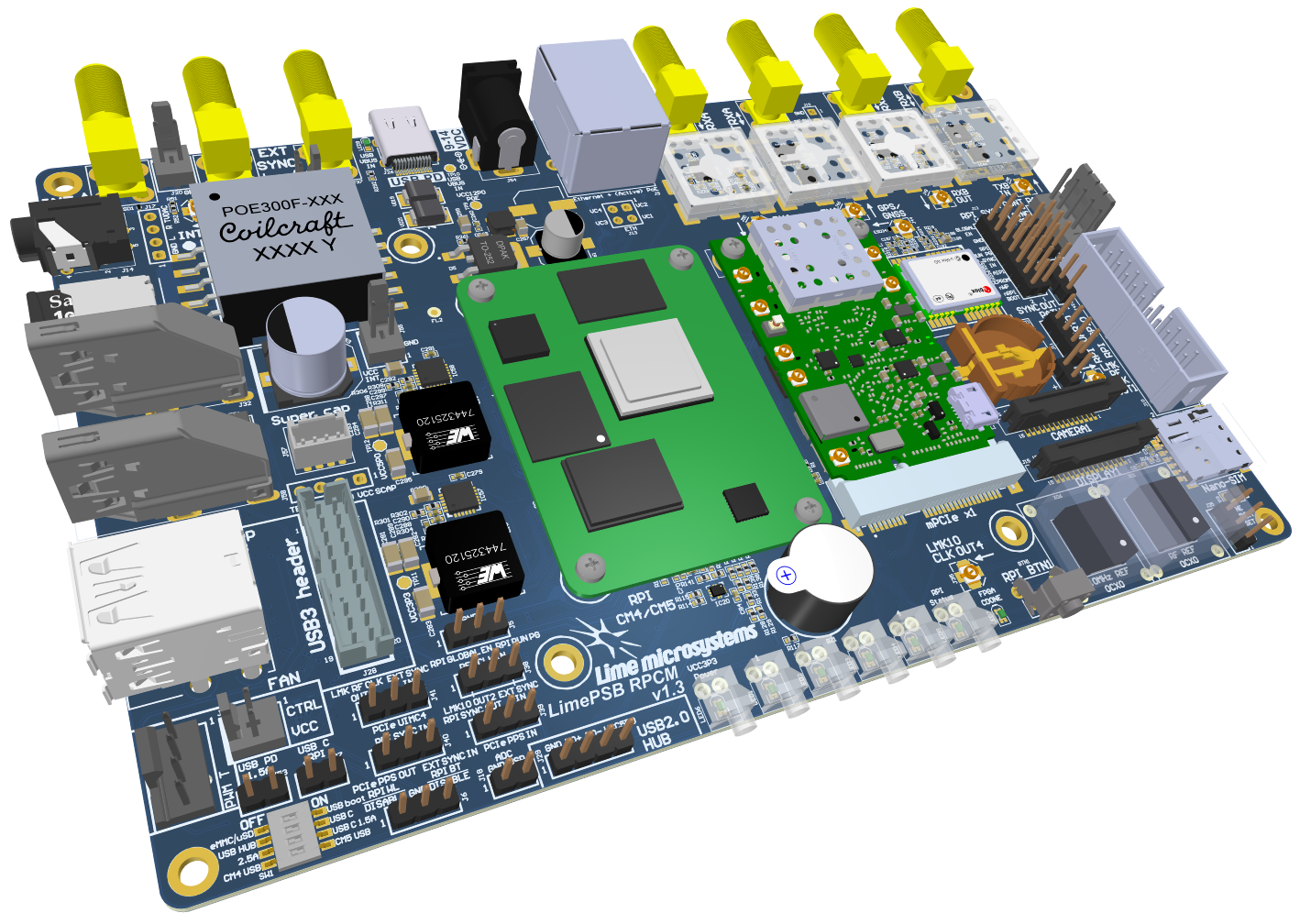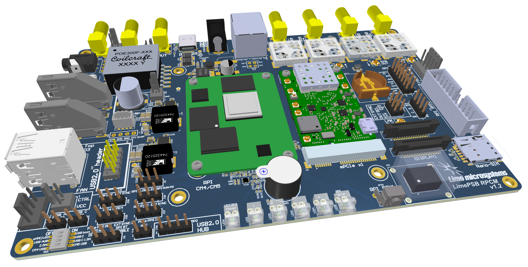 The LimePSB RPCM is carrier board for Raspberry Pi Compute Module and mPCIe card (by default LimeSDR XTRX board). LimePSB RPCM carrier board provides a hardware platform for developing and prototyping high-performance designs based on Raspberry Pi CM4 or CM5, RF front end, clock network and mPCIe card. It allows user to use the board in SDR, LoRa and other applications.
