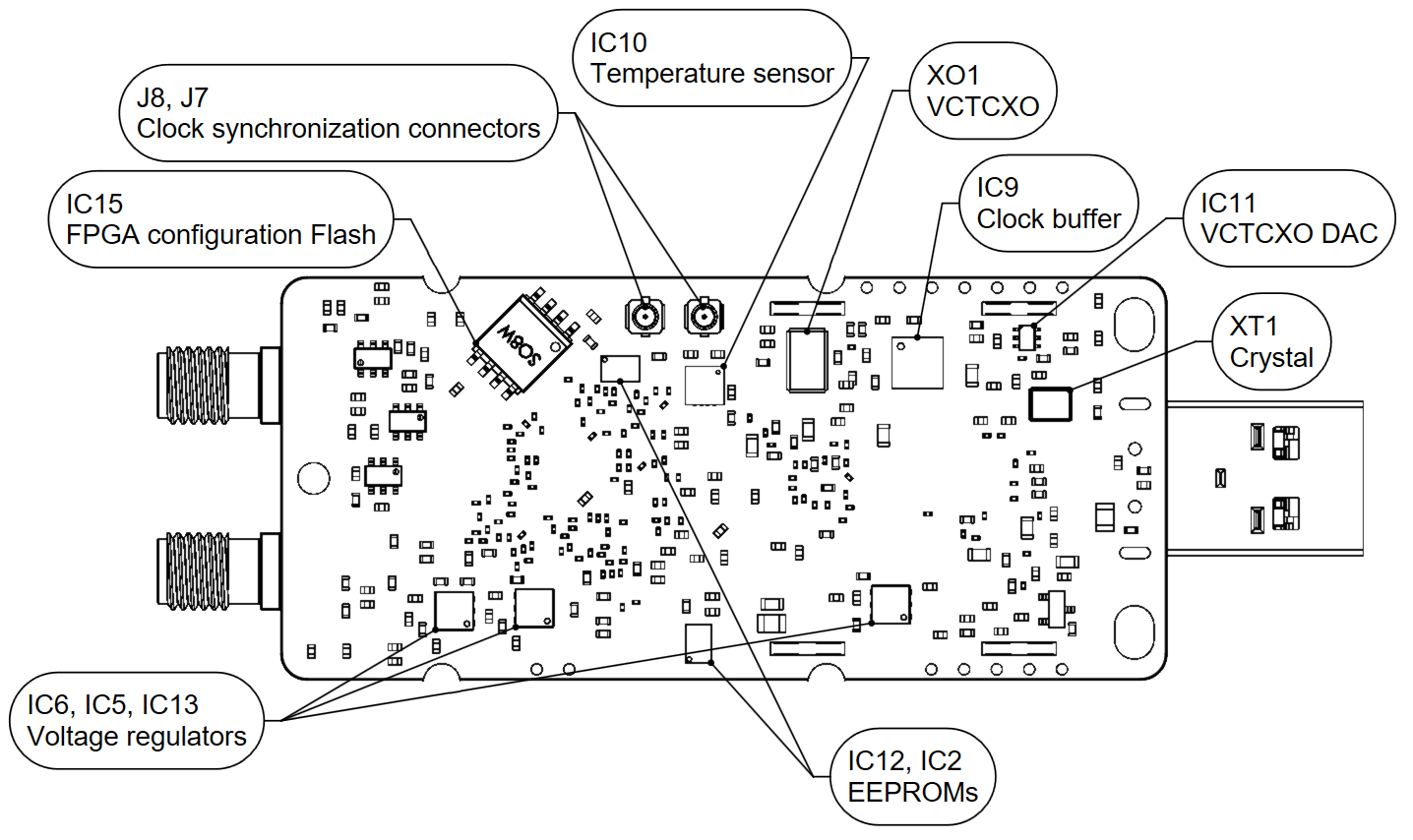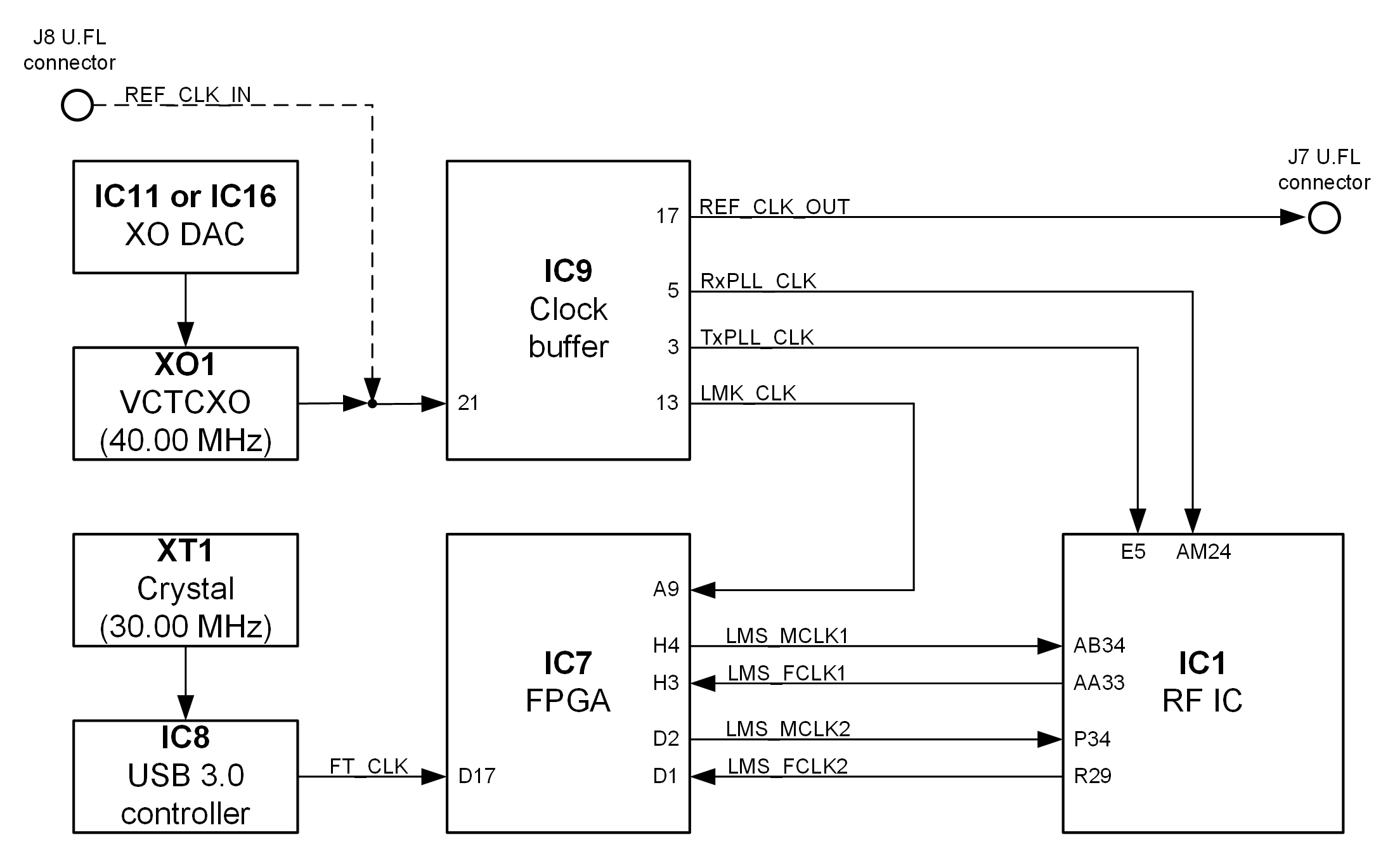 VCTCXO clock is connected to clock buffer IC9. Buffered VCTCXO clock is connected to RF transceiver, FPGA. Buffered VCTCXO clock is also connected to connector J7 (REF_CLK_OUT) and can be fed to external hardware for synchronisation. VCTCXO clock can be disconnected from clock buffer input (remove R63 and solder R66) and external reference clock can be supplied from connector J8 (REF_CLK_IN) instead of VCTCXO (40 MHz). Main board clock lines and other related information are listed in Table 14.