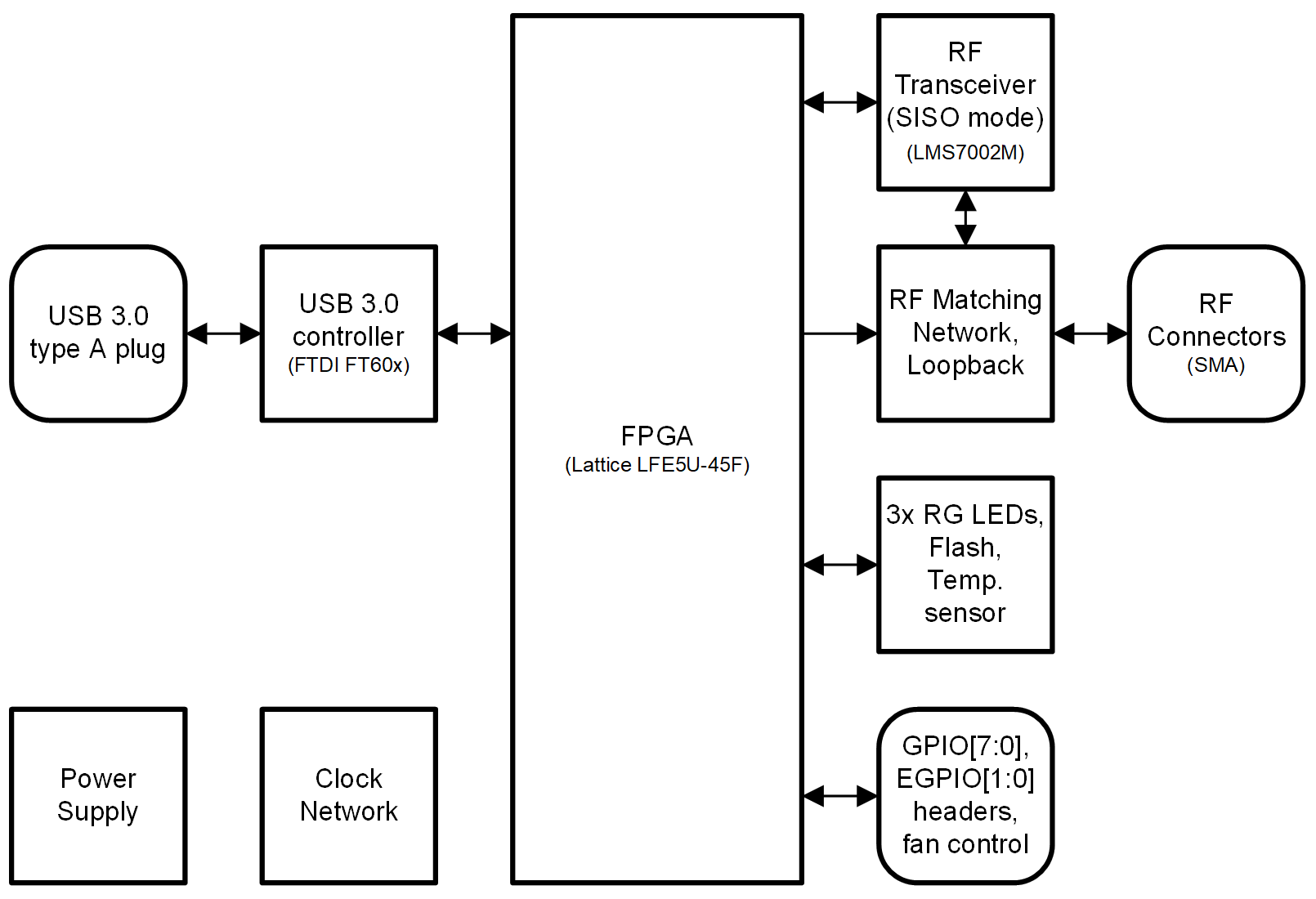 The heart of the LimeSDR Mini board is Lattice ECP5 (LFE5U-45F) FPGA. It’s main function is to transfer digital data between the PC through a USB 3.0 connector. The block diagram for LimeSDR Mini board is presented in the Figure 3.