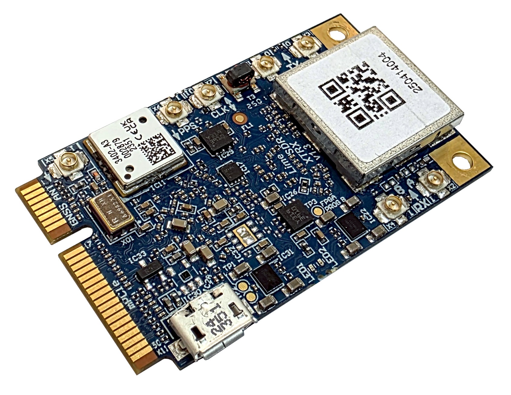 LimeSDR XTRX is a Mini PCIe expansion card software-defined radio (SDR), with a 2T2R MIMO capability and covering a frequency range from 30 MHz to 3.8 GHz, with up to 120 MHz bandwidth. It additionally may be used as a building block for Massive MIMO configurations, where multiple boards are employed and utilise a common frequency reference, for very high data rate applications.